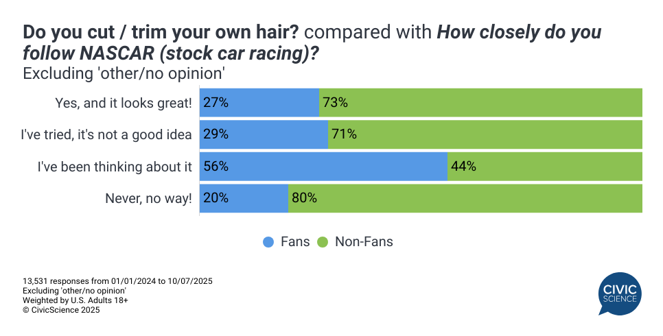A Need for Speed: While 56% of those considering the at-home haircut are NASCAR fans, just 20% of those in opposition to the idea say the same.