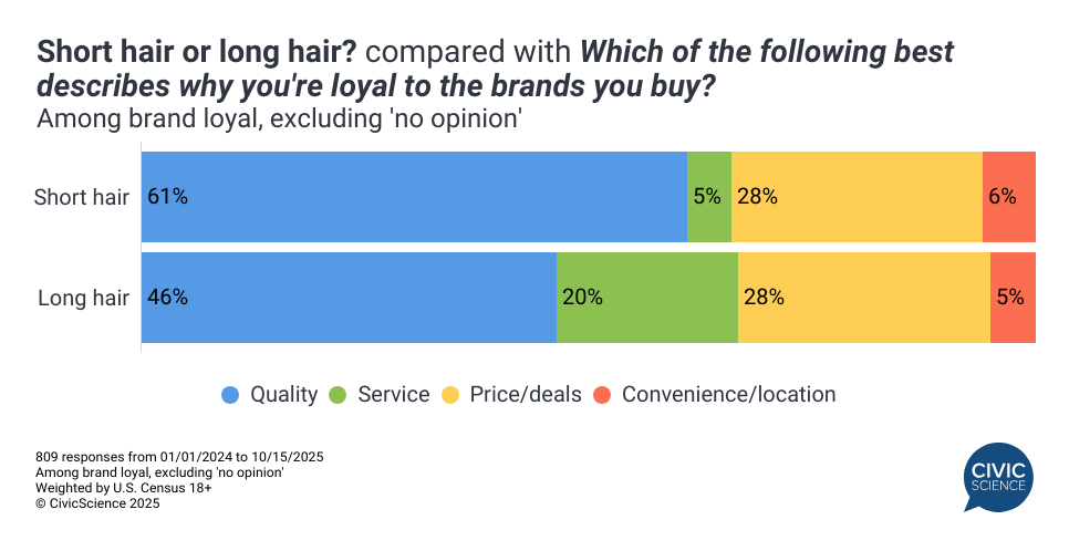 Brand Loyalty: While quality and price influence brand loyalty the most, those who prefer long hair are more than three times as likely as short hair fans to say that they are loyal to the brands they buy because of the service (18% vs. 5%).
