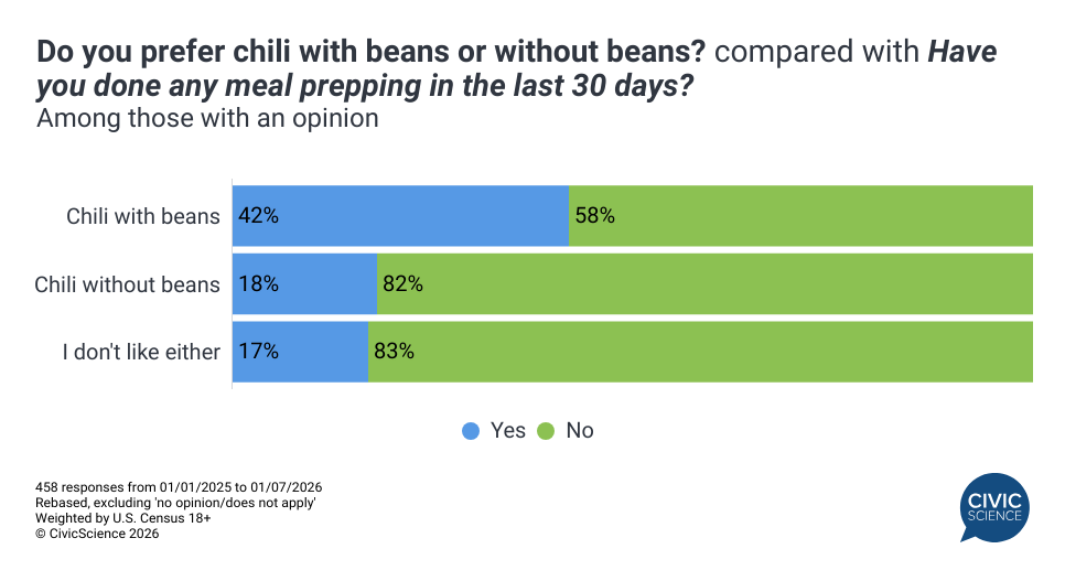 Meal Prep: Those who prefer chili with beans are more than twice as likely as those who prefer their chili without beans to say that they have meal prepped in the past 30 days (42% vs 17%).