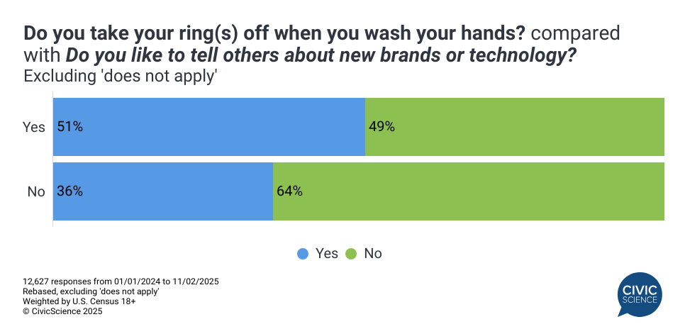 Tech Aware: While more than half (51%) of those who take their rings off to wash their hands say they tell others about new brands and technology, just 36% of those who do not take their rings off say the same.