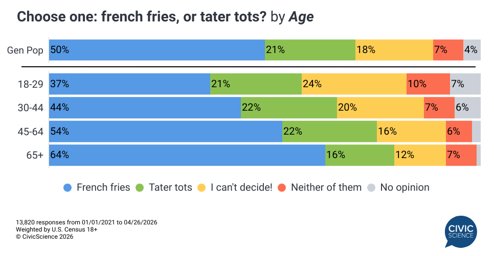 French fries win overall, garnering favor for 50% of U.S. adults. Conversely, 21% say they prefer tater tots and and 18% can’t decide between the two. Seven percent don’t want either, while just 4% say they have an opinion. The preference for French fries becomes more lopsided with age. Among adults 65 and older, 64% go with fries, 16% choose tater tots, 12% can’t decide, and 7% say neither. Younger adults tell a different story: among 18-29 year-olds, fries still lead at 37%, but tater tots pull 21%, and nearly a quarter say they simply can’t choose.