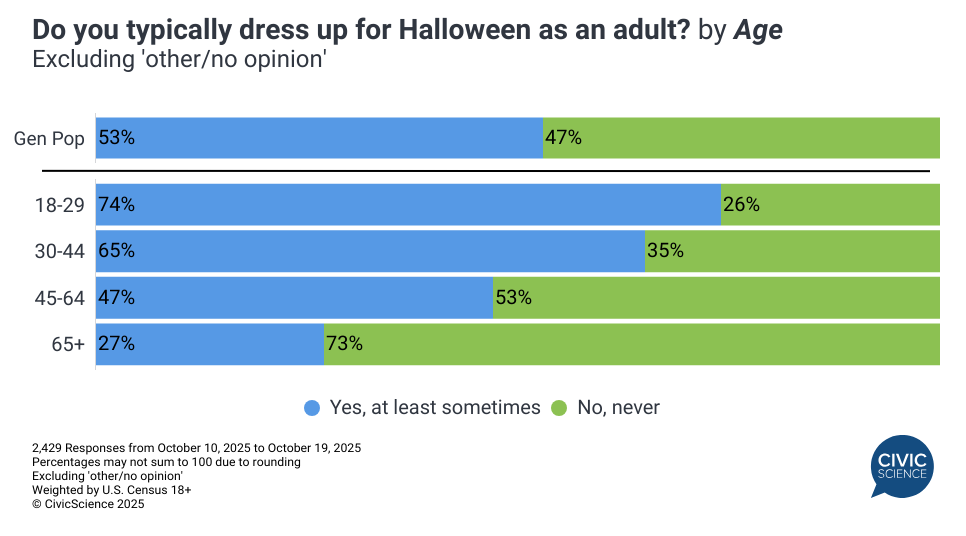 Just over half of American adults (53%) still wear Halloween costumes at least sometimes, including 15% who always do, while 47% never participate (excluding those with no opinion). This divide reveals clear demographic patterns and unexpected personality insights about who embraces Halloween’s playful side.