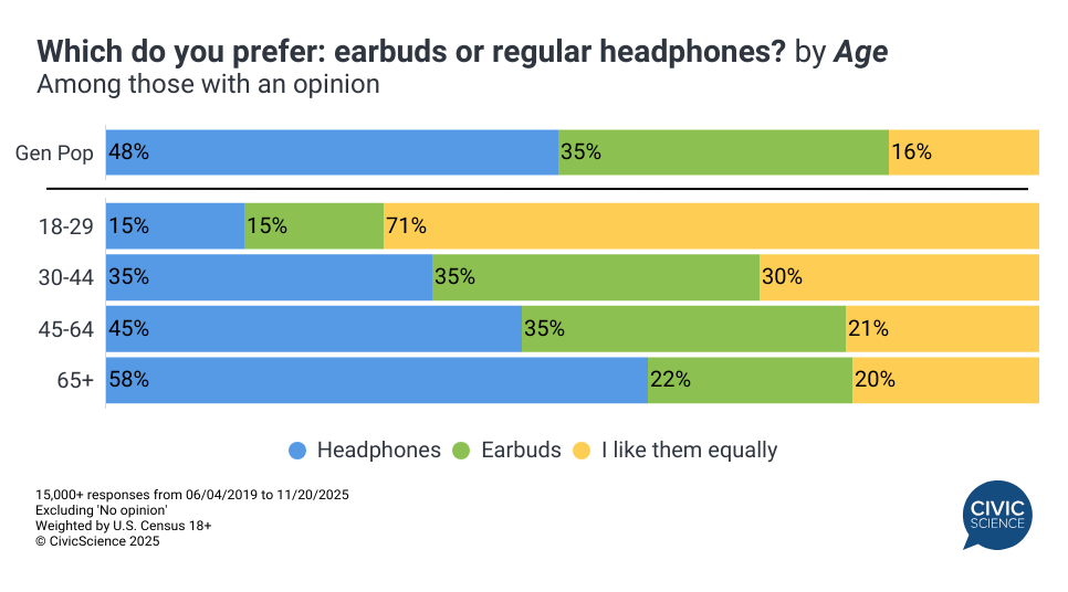 A look into how demographics shape preferences reveals quite the generational split. Gen Z, aged 18-29, is by far the most likely to say they like both options equally. At the other end of the spectrum, Americans 65+ lead the way in preferring headphones outright, while Millennials and Gen X drive the preference for earbuds. Men and women are nearly equally as likley to prefer headphones (36% to 35%, respectively). However, women lead men in preferring earbuds (32% to 23%).