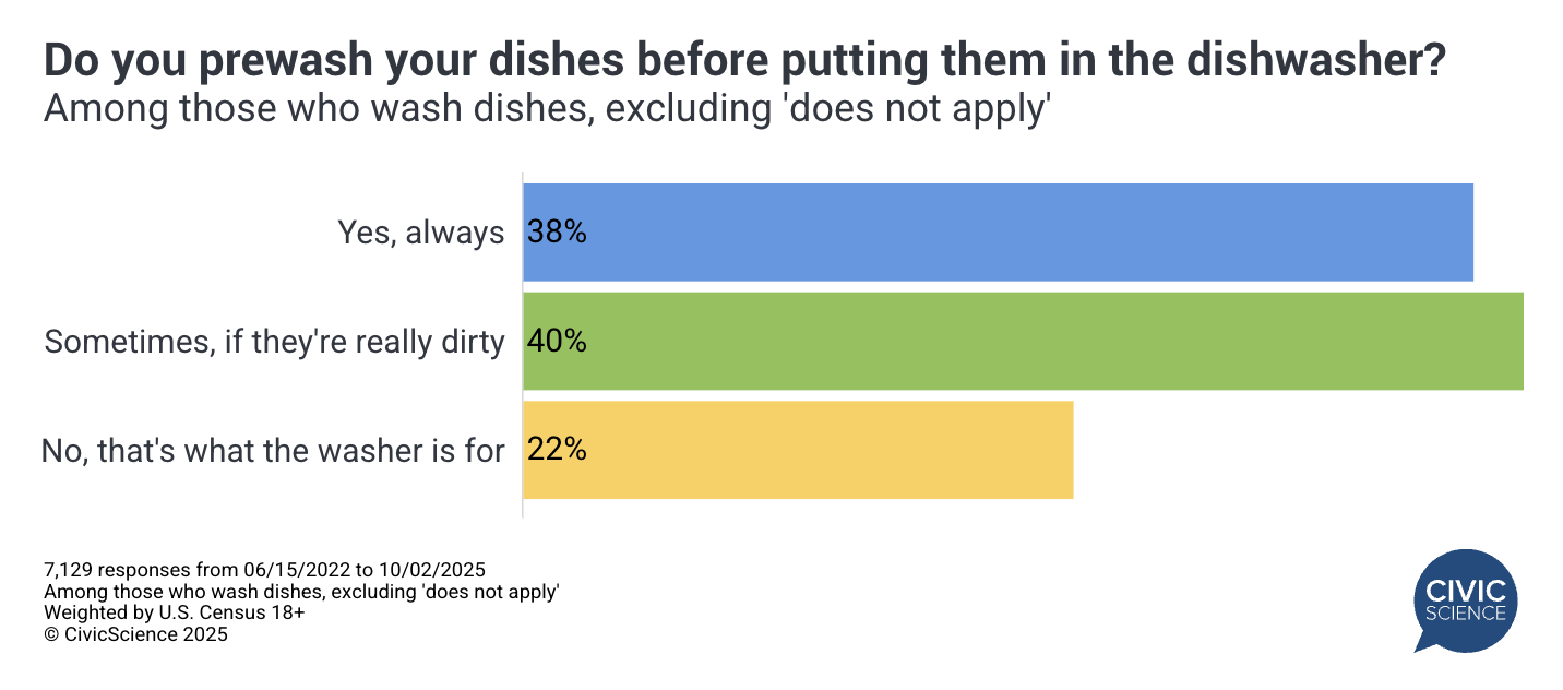 The common debate: do you wash dishes before putting them in the dishwasher? A CivicScience survey finds that 38% of U.S. adults say they ‘always’ wash dishes first, 40% say they ‘sometimes’ do if the dishes are really dirty, and 22% say ‘no—that’s what the dishwasher is for’ (among those who wash dishes, excluding ‘does not apply’).