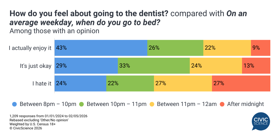 Bed Time: Those who enjoy going to the dentist are the most likely to go to bed between 8pm and 10pm, outpacing all others with the same bedtime by at least 14 percentage points.
