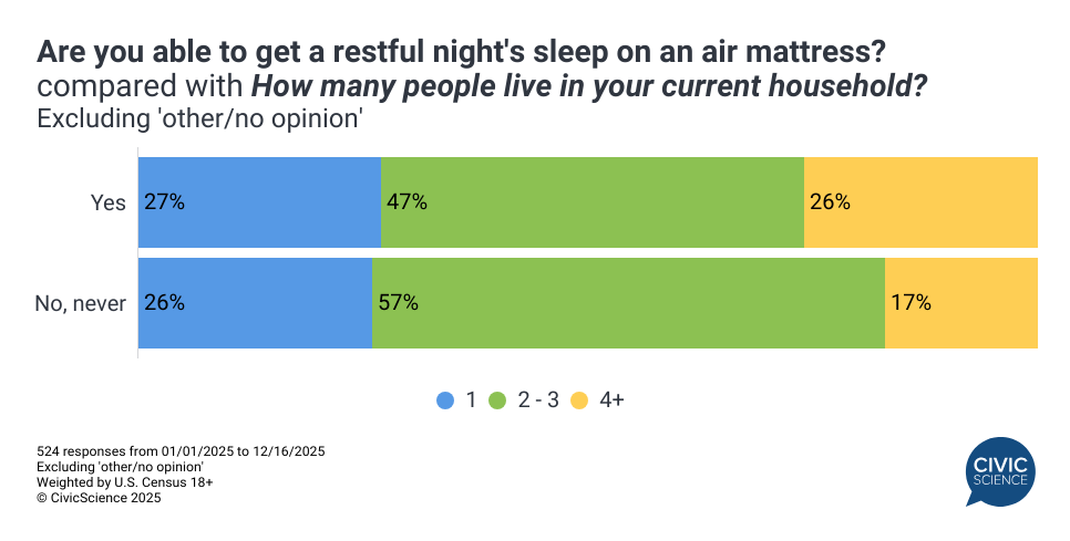 Full House: Those who sleep well on an air mattress are 12 percentage points more likely than non-restful air mattress sleepers to have four or more people living in their home.