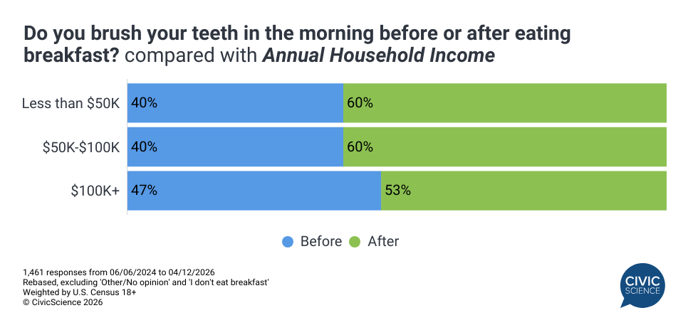 CivicScience data show that among those who eat breakfast, 44% brush their teeth before breakfast, while 56% do it after. Age plays a role, as adults aged 45-64 are the most likely to brush before, while those aged 65+ just barely edge out Millennials and Gen Z to rank as the most likely to brush their teeth after breakfast.