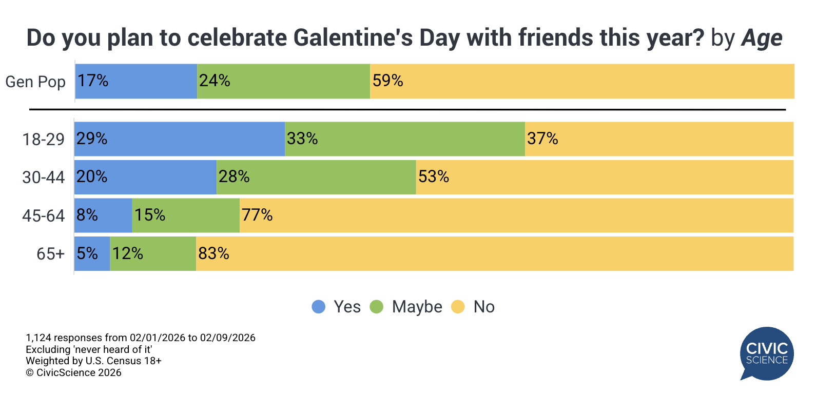 Among those familiar with Galentine’s Day, 17% tell CivicScience they plan to celebrate, another 24% are still deciding, and 59% say they don’t plan to celebrate. Intent to celebrate remains largely in line with 2025 levels (16%), suggesting steady interest in the friendship-focused holiday. Gen Z leads in interest, along with adults in middle-income households, city residents, and those living in the Northeast.