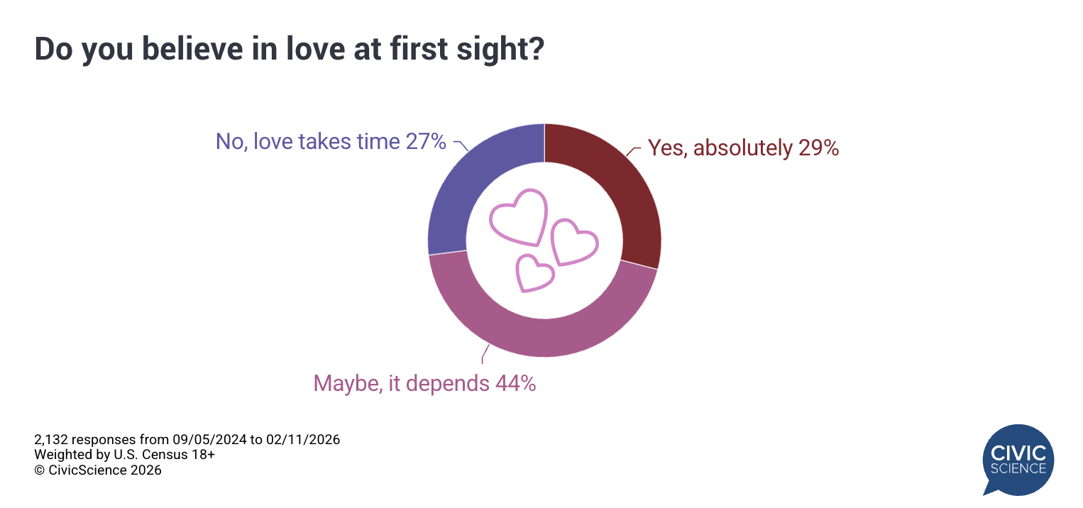 With Valentine’s Day right around the corner and love in the air, Americans remain divided on one of romance’s most debated ideas: love at first sight. According to a recent CivicScience poll, 29% of U.S. adults say they believe in love at first sight, while 44% say ‘maybe, it depends,’ and 27% say ‘no, love takes time.’