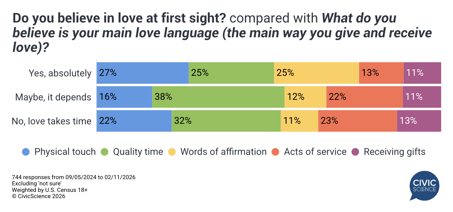Love Languages: Those who believe in love at first sight are most likely to say their primary love language is physical touch, while skeptics are more likely to choose quality time.