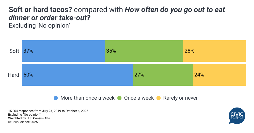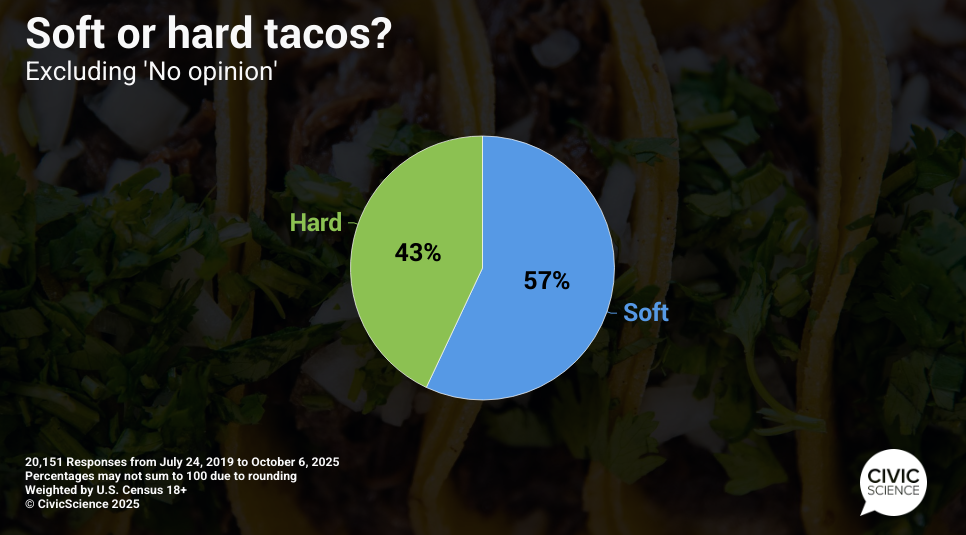 In honor of National Taco Day, CivicScience polling reveals America’s taco shell preference: soft shells dominate at 57% versus hard shells’ 43% (excluding those with no opinion). This 14-point gap masks fascinating demographic and lifestyle patterns that suggest our shell choice reflects deeper differences about tradition, convenience, and family life.
