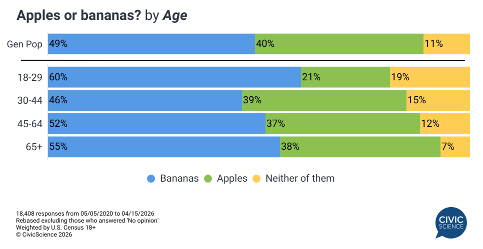 April 15 is National Banana Day, so what better time to take at an American fruit debate? An ongoing CivicScience poll pits bananas against apples, and the latest update among Americans 18+ with an opinion shows nearly half prefer bananas. Eleven percent, meanwhile, say they don’t want either one.