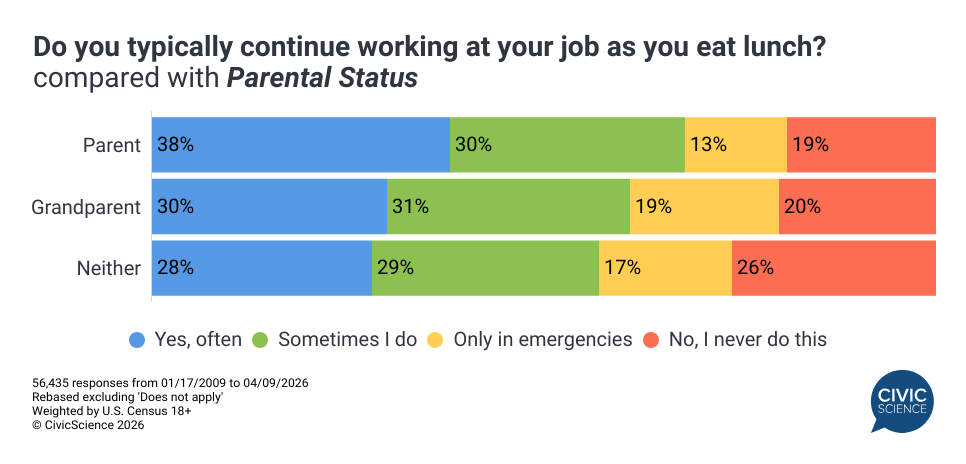 A look at top-line demographic data shows that those who make $100K+ annually are more likely than lower-income earners to do a working lunch more frequently, outpacing all others by at least 11 percentage points. Parents are also at least 8 percentage points more likely than grandparents and non-parents to say they ‘often’ work during lunch–perhaps so they can better respond to family responsibilities at the end of the day.