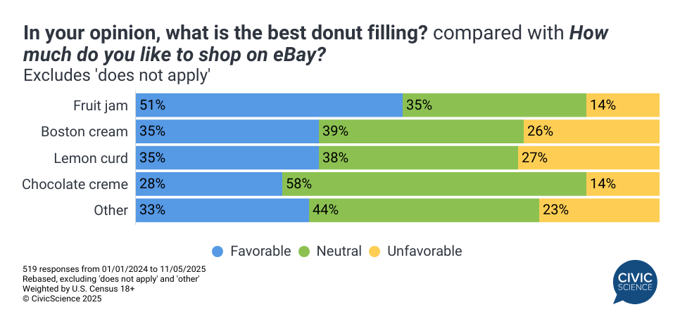 eBay Experience: Over half (51%) of those who prefer a fruit jam filling are favorable towards shopping on eBay, outpacing those who prefer all other donut fillings by at least 16 percentage points.