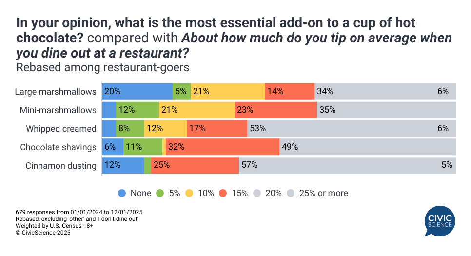Tip Skippers: Large marshmallow fans are the least likely to tip when dining out, as 20% describe their average tip as ‘none.’ This outpaces all other hot chocolate fans by a minimum of eight percentage points.