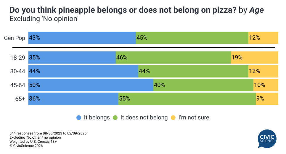 February 9 is National Pizza Day! In honor of this, CivicScience asked Americans about one of the most contentious debates in food: Does pineapple belong on pizza? Here’s what they’ve told us.