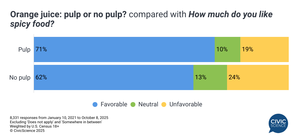 The spice tolerance data adds another layer: pulp lovers overwhelmingly embrace spicy food at 71% favorable versus no-pulp drinkers’ 62%. This nine-point gap reinforces the pattern—those who tolerate orange juice texture seek intensity in other foods too.