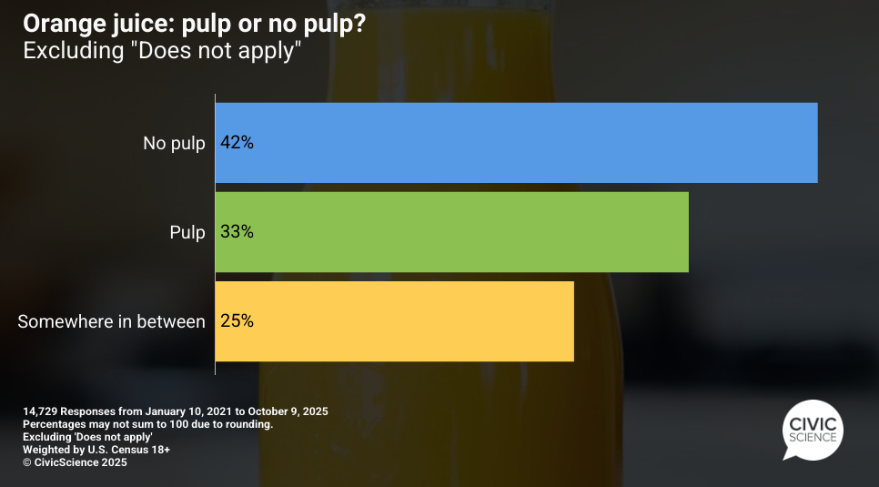 When it comes to orange juice preference, Americans are split, but decisive: 42% prefer no pulp, 33% want pulp, and 25% land somewhere in between. This textured debate reveals unexpected patterns about adventure, fitness, and even reading habits that suggest pulp preference might be a personality test in a glass.