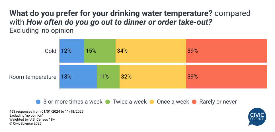 Cooking: Room temperature water fans are 10 percentage points more likely than cold water fans to say that they don’t like to cook, and six percentage points more likely to get takeout or delivery three or more times a week.