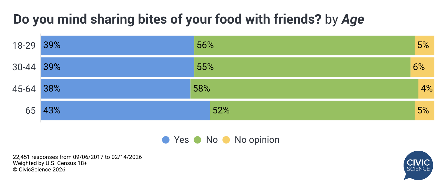 From splitting appetizers to sneaking a fry off someone else’s plate, sharing food can either feel friendly or frustrating. So where do Americans stand? According to a CivicScience poll, 56% say they don’t mind sharing bites of food with friends, while nearly 40% say they do mind. The remaining 5% say they’re indifferent, suggesting that while most are open to sharing, a sizable minority would prefer to keep their plate to themselves.