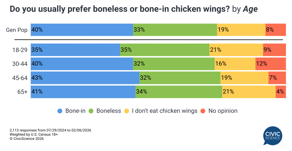 Beyond the topline and demographics, additional survey data offers a glimpse of how those who say they prefer bone-in wings compare with those who lean towards boneless wings: