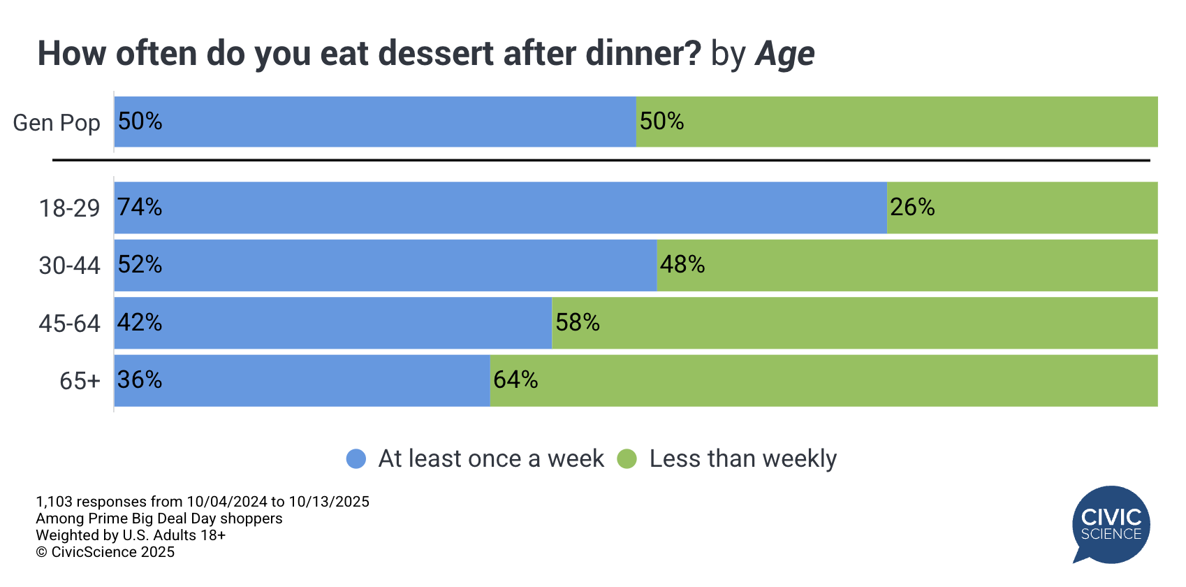 For many Americans, dessert is a regular indulgence after dinner, but for others, it’s a rare treat. A new CivicScience survey shows that dessert eating is split evenly down the middle: 50% of U.S. adults say they eat dessert at least once a week, while the other 50% indulge less often.