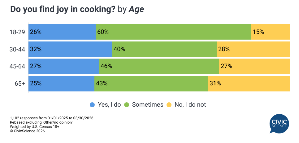 Cooking can be a fun experience or a chore, but how do Americans really feel about cooking? CivicScience has been polling Americans on whether they find joy in cooking since 2022, and the latest results are in: One-third (33%) of U.S. adults 18+ say they do find joy in cooking. while a plural (39%) ‘sometimes’ do. Conversely, 23% are firm that they do not find any joy in cooking, and 5% have no opinion either way.