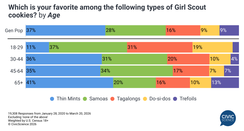 Among the cookies studied, the latest CivicScience survey data show that Thin Mints lead among U.S. adults (excluding ‘none of the above’). However, cookie preferences vary dramatically by age: just 11% of those aged 18-29 favor Thin Mints, compared to 41% of respondents aged 65+. Instead, Gen Z’s are most likely to prefer Samoas or Tagalongs. Men and women are nearly equally as likely to prefer Thin Mints (35% to 38%, respectively), but men are slightly more likely to say Tagalongs and Do-si-dos are their favorite. Women are more likely to enjoy Trefoils.
