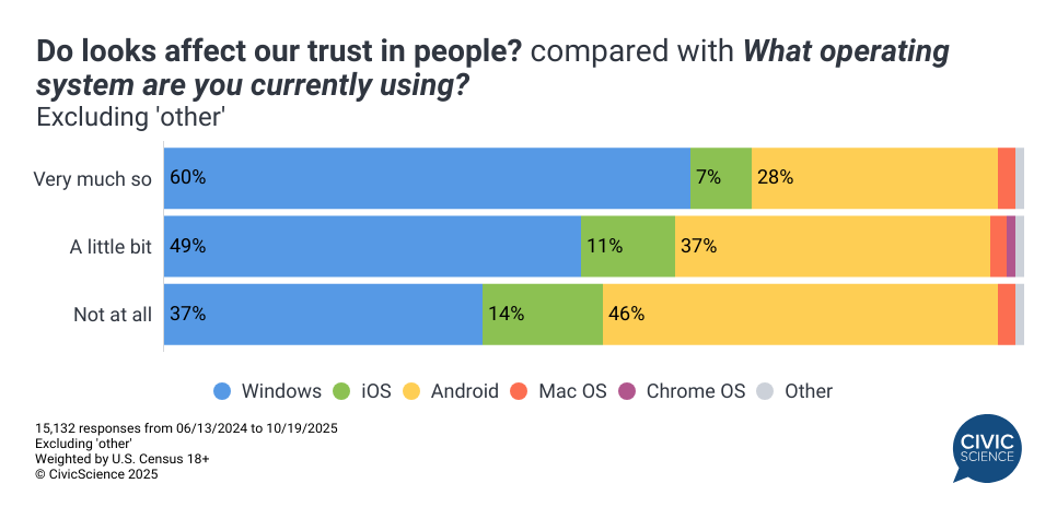 Operating Systems: Those who say trust is very impacted by looks are 23 percentage points more likely than those who are not impacted by looks to be currently using a Windows operating system.