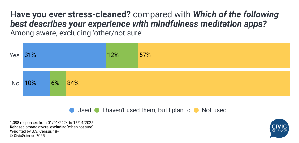 Meditation App Users: Stress-cleaners are three times as likely as non stress-cleaners to have used a meditation app.