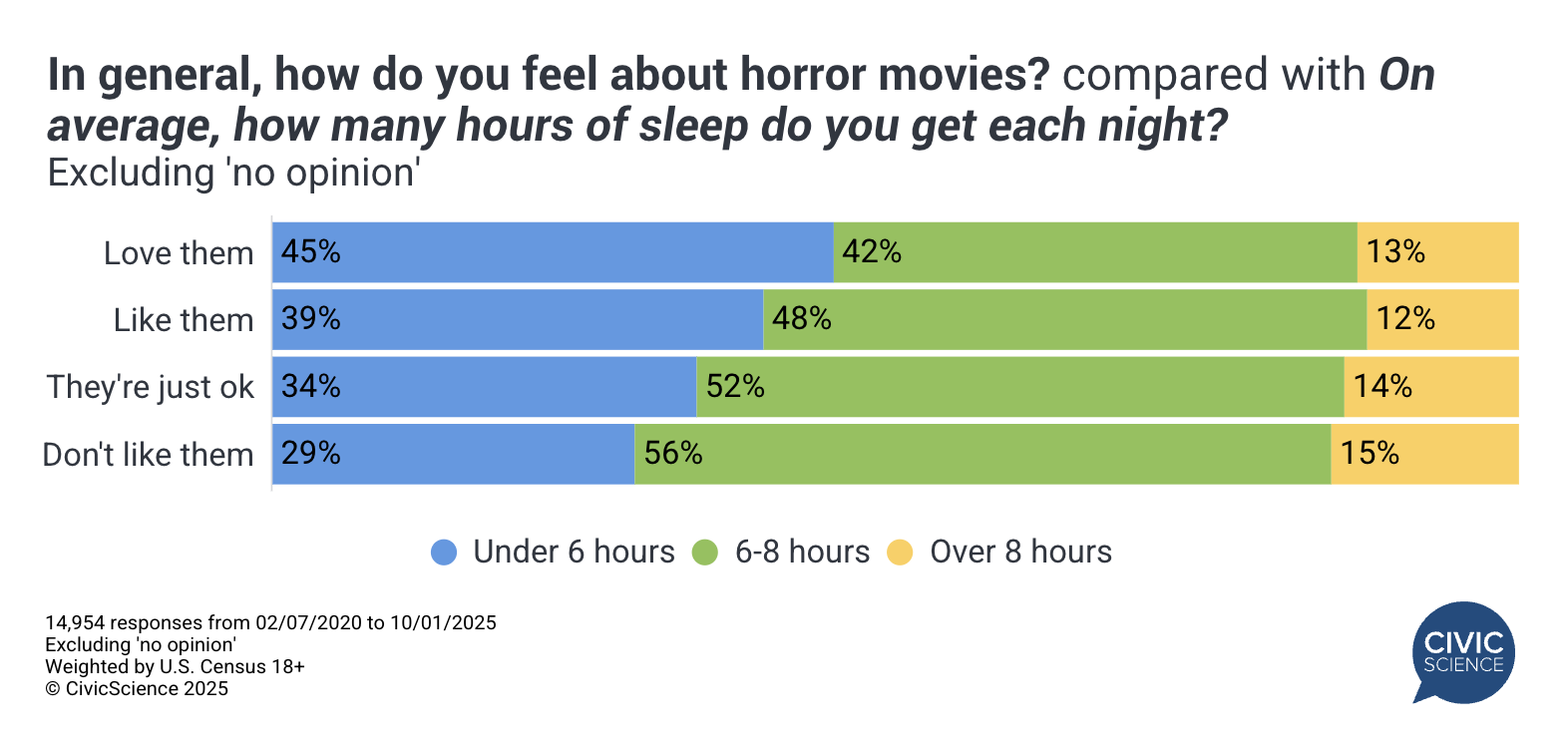 Sleep: Scary-movie lovers over-index compared to non-fans in getting under 6 hours of sleep a night.