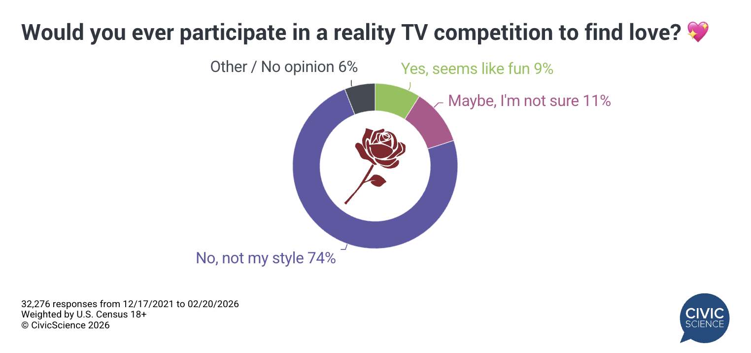 From The Bachelor to Love Island, reality TV competitions centered on romance continue to draw massive audiences. But how many Americans would actually step into the spotlight themselves? According to a CivicScience poll of more than 30K respondents, 9% say they would participate in a reality TV competition to find love, while 11% say ‘maybe.’ A strong majority (80%) say they wouldn’t be interested at all.