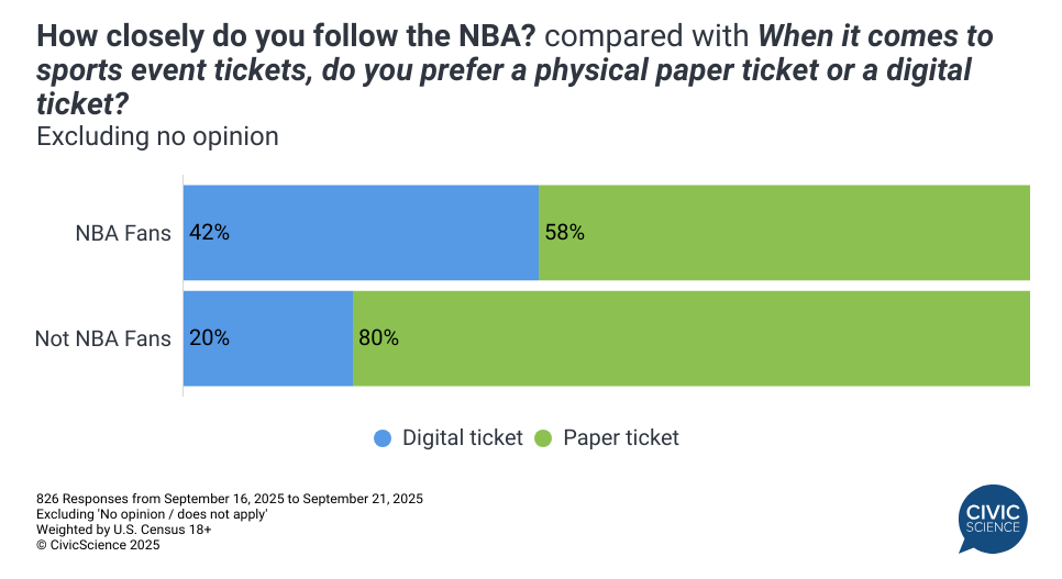 The Fandom Connection: NBA fans are significantly more open to digital tickets at 42% compared to 20% among non-fans. Non-NBA fans, on the other hand,  strongly prefer paper at 80%. This could reflect the NBA’s younger, more tech-savvy fanbase, or the league’s emphasis on mobile-first experiences and social media integration.